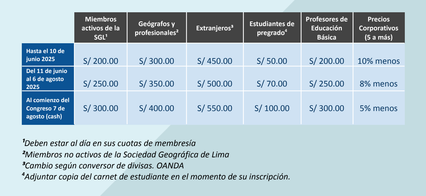 IMPORTANTE: Para culminar su inscripción, es necesario efectuar el pago y enviar el voucher. El voucher de pago deberá tener el nombre del participante en el concepto de pago. El concepto de pago es: Congreso 2025 -NOMBRE Y APELLIDO. Ponentes y asistentes, todos deben completar el formulario de pre – inscripción y enviar el voucher de pago al email pagoinscripcion@socgeolima.org.pe.